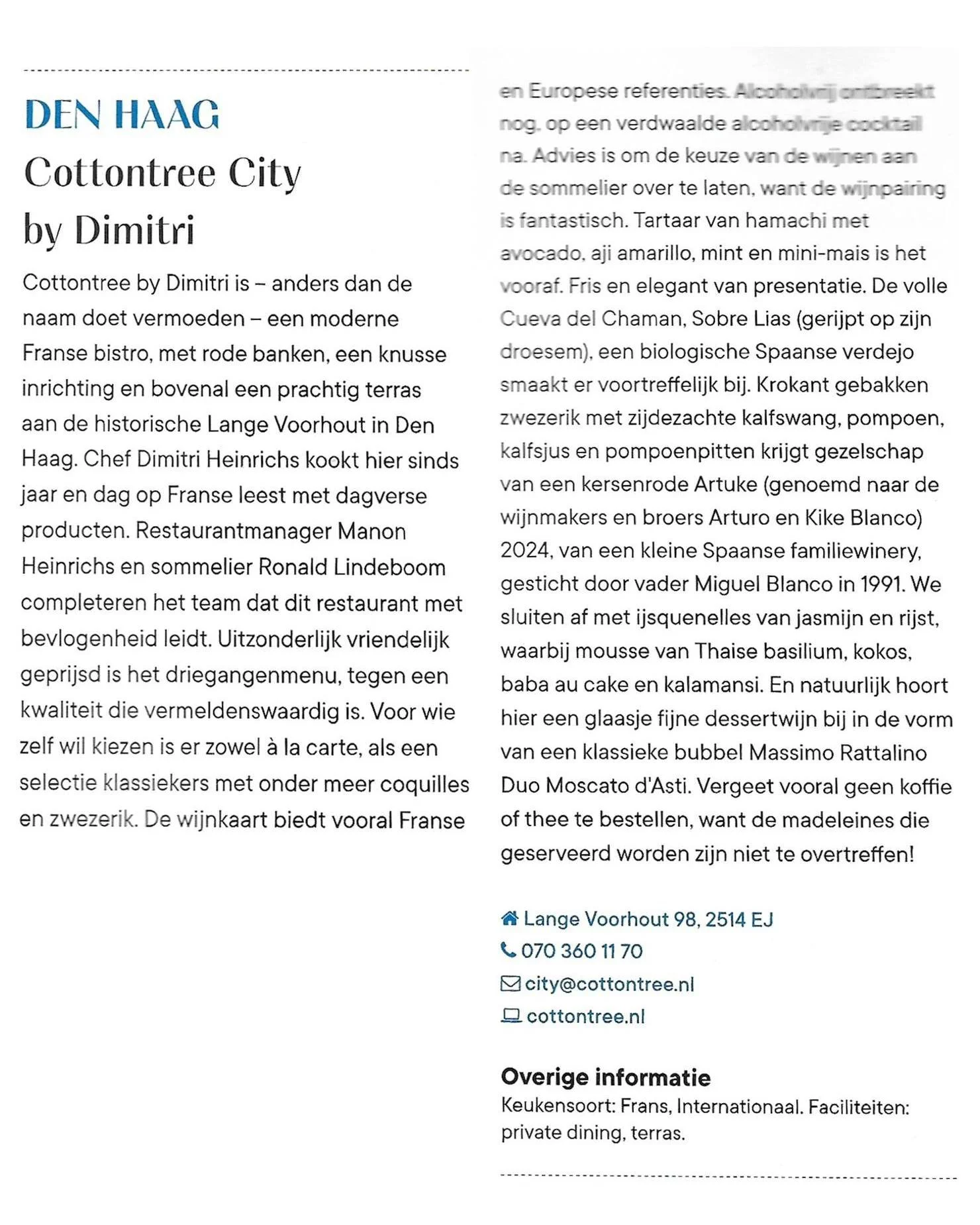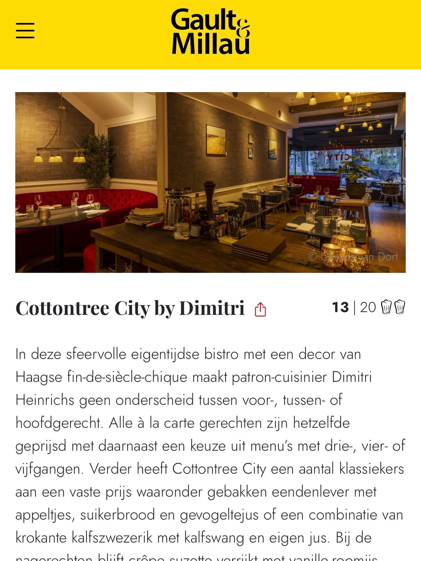 Cottontree City is een moderne stadsbistro met betaalbare, eerlijke en smaakvolle gerechten. U geniet hier al van 3 gangen voor € 48,- Ook is er een 4 of 5 gangen menu te bestellen.